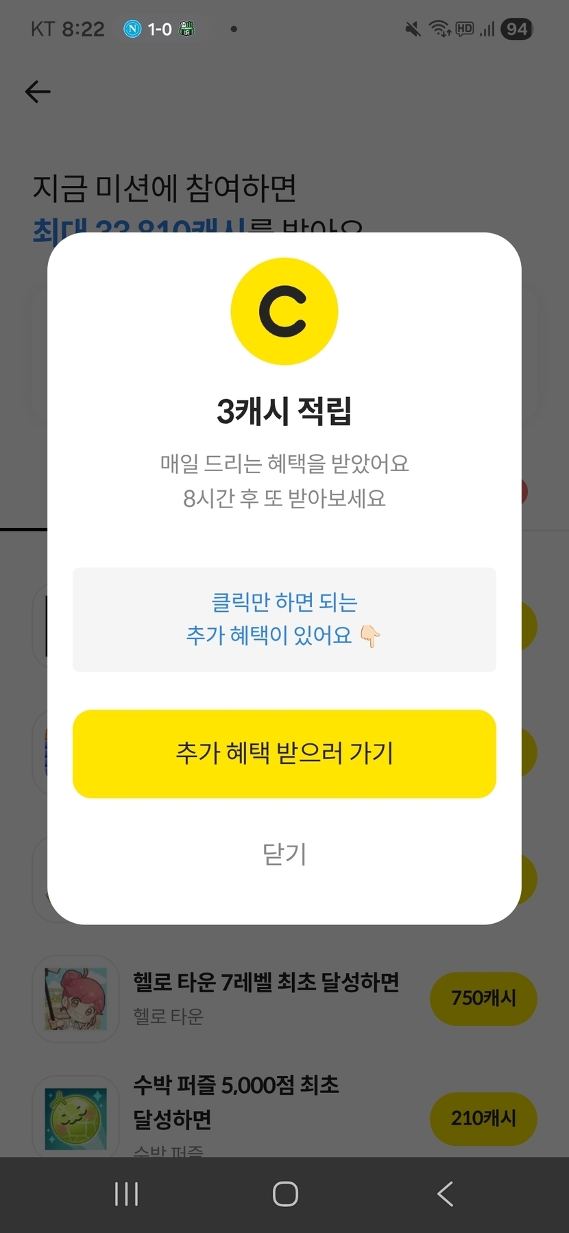26.01.18 59 읽음 캐시슬라이드 맞춤적립 3캐시 적립했어요 ~~ 걷기마니아야 구독하기 1 1 콘텐츠의 수익 3 캐시슬라이드 맞춤 적립 3캐시 득템 ~~ ^^ 1 0 / 300 입력
