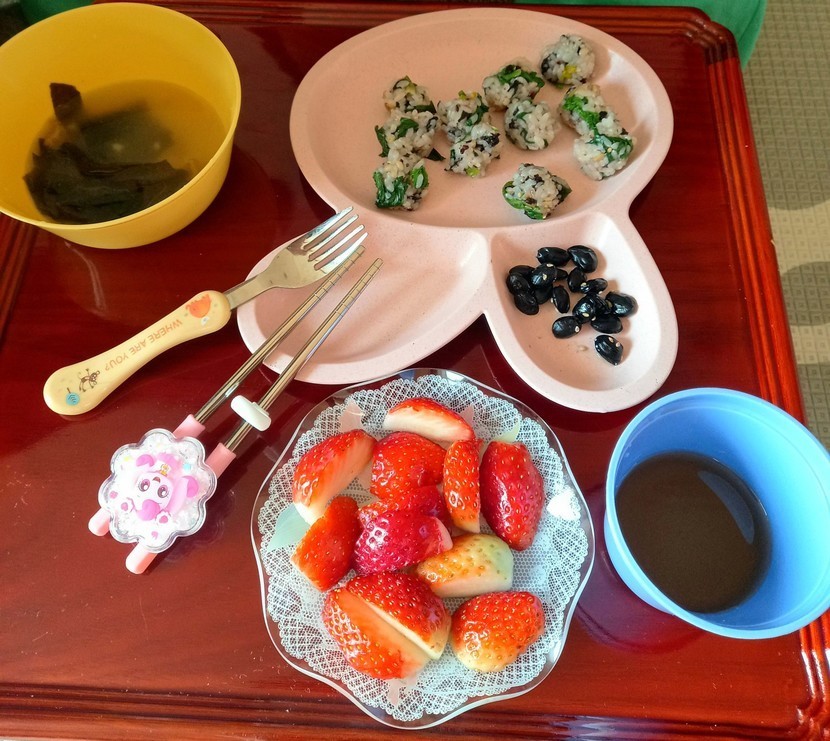 손녀점심 ㅡ 시금치 주먹밥 + 북어미역국 + 딸기 + 콩장