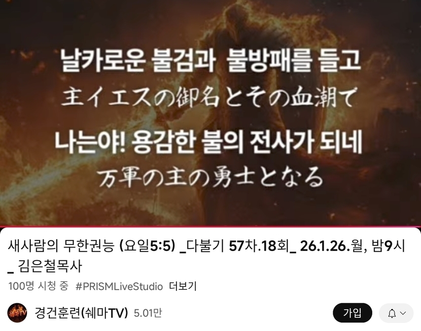 5일 전 135 읽음 195.2026.1.26.월 다니엘기도회 성령이불타는교회 쉐마TV1 구독하기 27 25 콘텐츠의 수익 5 https://www.youtube.com/live/W8v7vLR9q9Y?si=napHQnJ-DqxJSk5i 25 0 / 300 입력