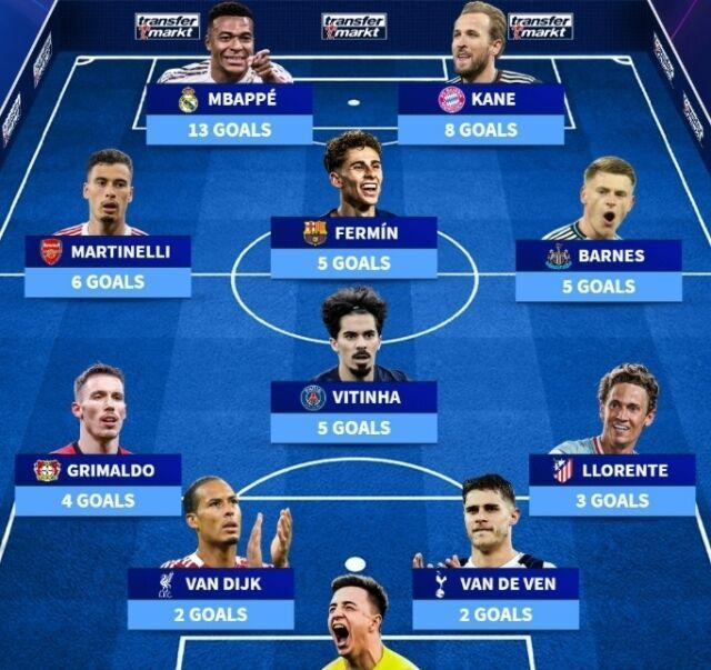 올 시즌 UEFA 챔피언스리그에서 득점력을 과시한 선수들로 구성된 베스트11 공격수에는 음바페(레알 마드리드)와 케인(바이에른 뮌헨)이 선정됐다. 미드필더에는 마르티넬리(아스날), 페르민 로페스(바르셀로나), 반스(뉴캐슬 유나이티드), 비티냐(PSG)가 이름을 올렸고 수비진은 그리말도(레버쿠젠), 판 다이크(리버풀), 판 더 벤(토트넘), 요렌테(AT마드리드)가 구축했다. 골키퍼에는 트루빈(벤피카)이 선정됐다.