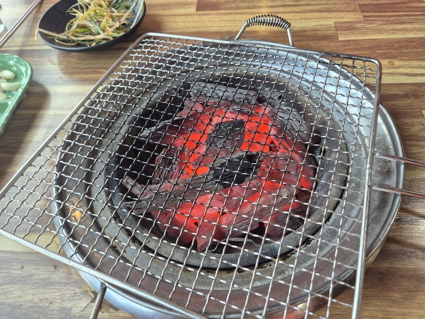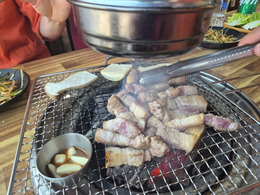 숳불에 오겹살 구우니 여기가