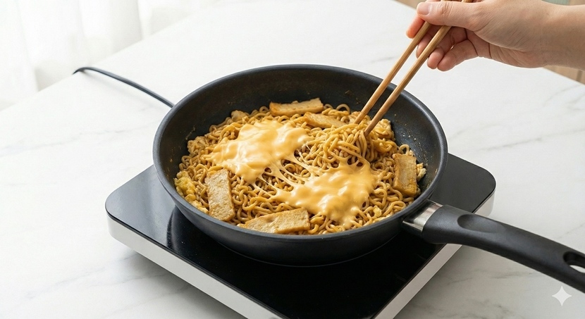 계란이 반쯤 익었을 때 라면 스프 1봉을 넣고 잘 섞어준다. 여기에 물기를 뺀 면을 투입해 1~2분간 볶으면 스프가 면에 골고루 배어든다. 취향에 따라 대파나 마늘을 추가하면 풍미가 한층 살아난다.