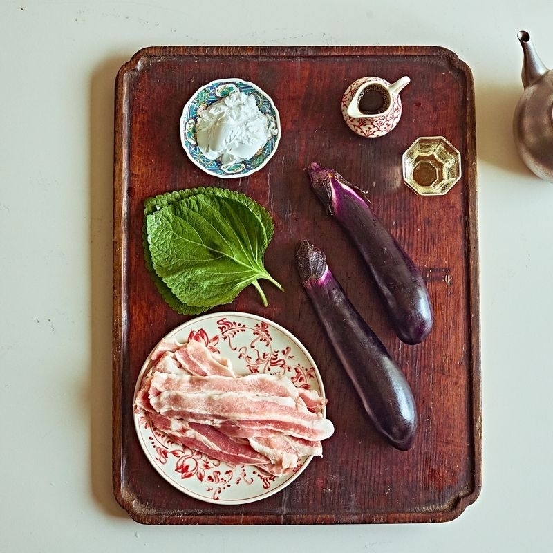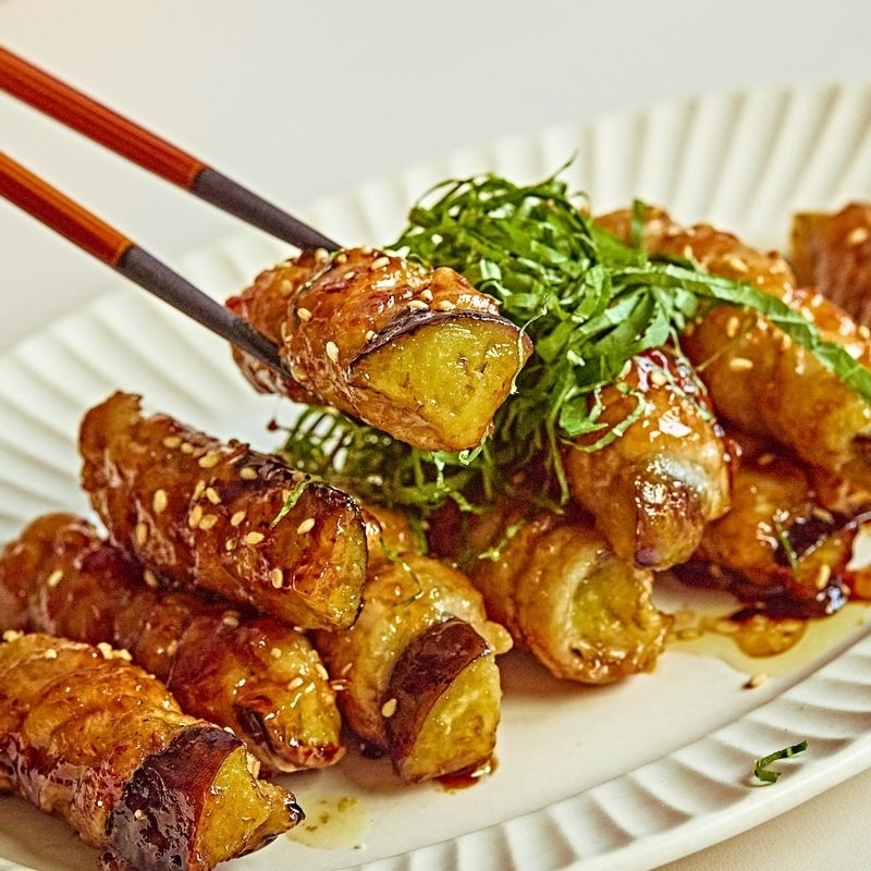 만드는 과정은 얇은 돼지고기로 가지를 돌돌 말아 전분을 입히고, 달콤·짭조름한 간장 소스를 더해 만듭니다. 겉은 노릇하고 속은 촉촉한 맛을 즐길 수 있습니다.