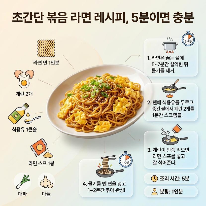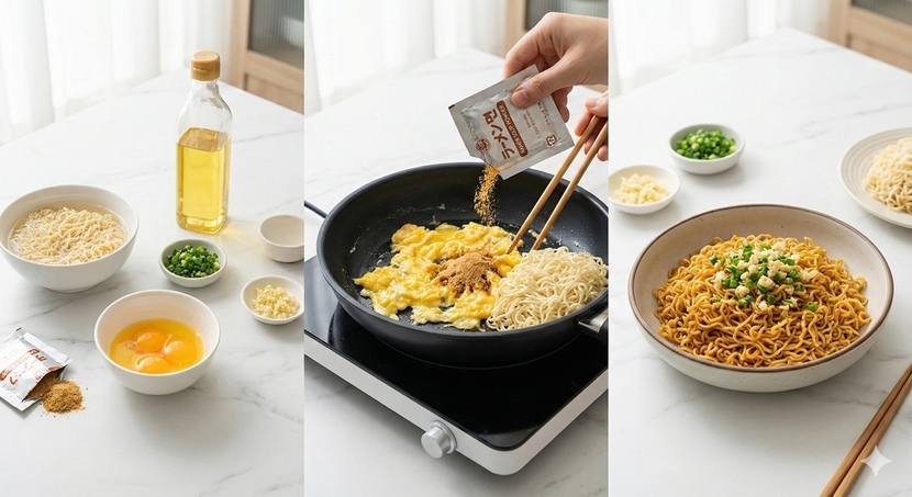 계란이 반쯤 익었을 때 라면 스프 1봉을 넣고 잘 섞어준다. 여기에 물기를 뺀 면을 투입해 1~2분간 볶으면 스프가 면에 골고루 배어든다. 취향에 따라 대파나 마늘을 추가하면 풍미가 한층 살아난다.