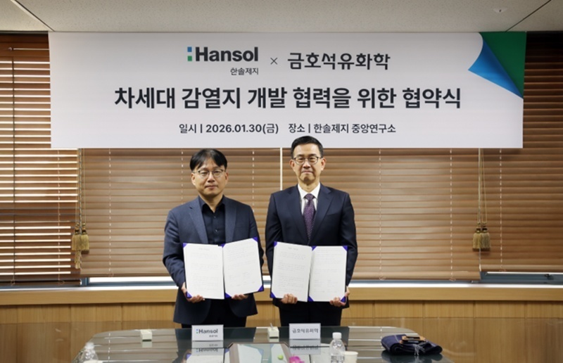 30일, 금호석유화학(대표이사 백종훈)과 한솔제지(대표이사 한경록) 양사가 대전 소재 한솔제지 중앙연구소에서 차세대 감열지 제품 개발을 위해 양사간 기술 협력을 강화하는 내용의 업무협약(MOU)을 체결했다고 밝혔다.