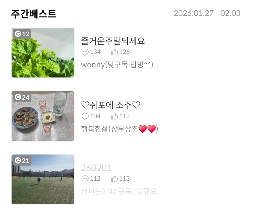 26.02.04 1,170 읽음 260203 캐피는3!4? 구독!!땡큐요! 구독하기 139 134 콘텐츠의 수익 21 떡국으로 때우기주간베스트 감사합니다 오늘도 웃는 좋은하루되세요 134 0 / 300 입력
