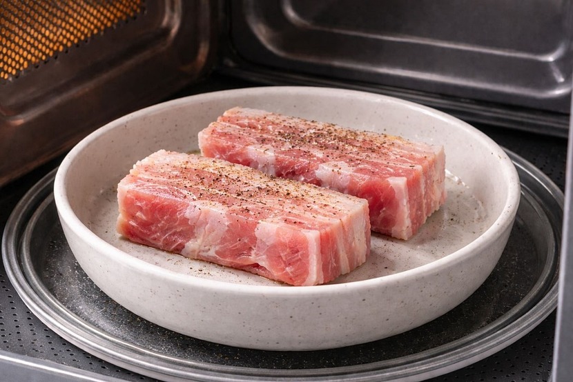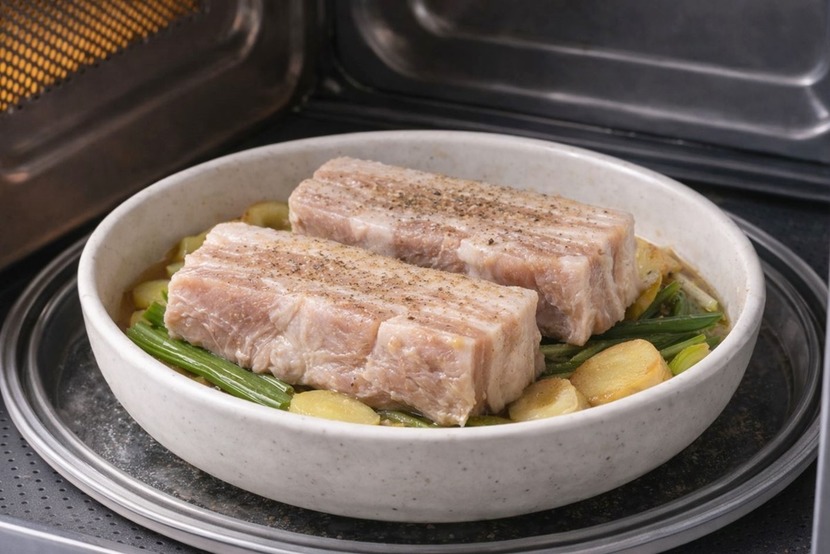 고기를 담을 용기는 반드시 전자레인지 사용이 가능한 내열 용기를 선택해야 한다. 삼겹살은 조리 과정에서 기름이 많이 나오기 때문에 얕은 접시보다는 깊이가 있는 그릇이 안전하며 기름이 넘치지 않도록 여유 공간이 있는 용기가 좋다. 용기 바닥에는 마늘 몇 쪽과 대파 한 대, 생강 한 조각을 넣어 향을 더해 주면 고기 냄새가 한결 부드러워진다.