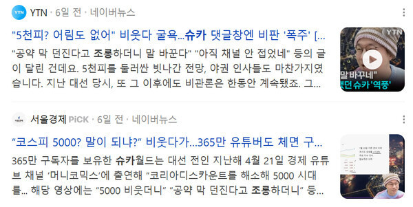 에너지경제는 지난달 30일 「단독 코스피 5000 ‘비웃던’ 유튜버 슈카월드가 거래소 입 노릇?」 기사를 통해 “코스피5000 대선공약을 비꼰 발언으로 논란을 빚고 있는 ‘슈카월드’가 스피5000 정책의 주무 기관인 한국거래소의 올해 홍보전략을 담당하는 8억 원 규모 홍보대행 용역에 낙찰된 것으로 밝혀졌다”라고 보도했다.