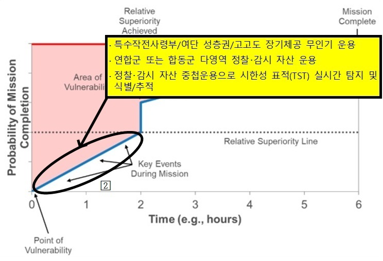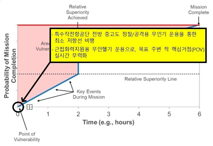 이와 같은 상대적 우세 그래프에 앞서 새롭게 특수작전사령부(여단)에 덧입혀지는 무기체계를 적용하면 다음과 같은 효과를 기대할 수 있다. 우선, 특수작전사령부 예하 특수작전항공단은 중고도 정찰/공격용 무인기를 운용하여 최소 저항선을 따라 목표지역에 접근할 수 있다. 또한, 근접화력지원용 무인헬기로 목표를 방호하는 적 핵심거점(POV)을 실시간 무력화할 수 있다([1]).