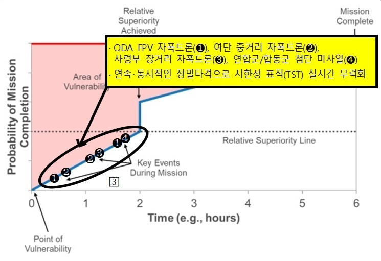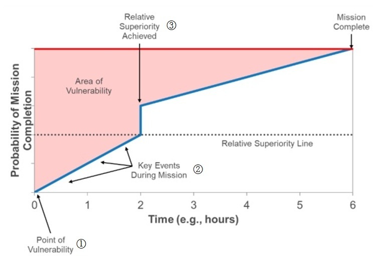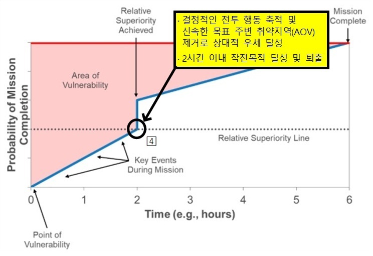 이런 상대적 우세 그래프가 내포하고 있는 의미는 크게 다음 세 가지이다. 첫 번째는 특수작전부대가 임무 성공 확률을 높이기 위해서는 적진에 침투하자마자 결정적인 전투 행동을 통해 특수작전부대의 취약점(Point of Vulnerability, POV)을 상쇄해나가야 한다(①). 두 번째는 이런 결정적 전투 행동을 연속 또는 동시적으로 수행하여 목표 주변을 둘러싸고 있는 취약지역(Area of Vulnerability, AOV)을 신속하게 거둬내야 한다(②). 세 번째는 이런 연속적이고 동시적인 결정적인 전투 행동이 축적되면 특수작전부대는 상대적 우세를 달성하는 시점에 도달하게 되는데, 이에 소요되는 시간은 특수작전부대가 적진에서 유한한 자산을 운용한다는 점을 고려하여 2시간 이내여야 한다(③).