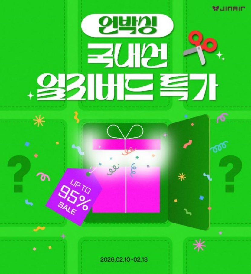 국내 여행 수요가 본격적으로 늘어나는 설 연휴 시즌을 앞두고 항공권을 저렴하게 구매할 수 있는 기회가 열렸다. 진에어가 국내선 전 노선을 대상으로 최대 95% 할인을 적용한 얼리버드 특가 프로모션을 선보이면서, 출발 시기와 노선에 따라 1만 원대 항공권도 등장했다. 항공권 판매는 한정된 기간 동안만 진행돼 미리 여행을 계획하는 소비자들의 관심이 쏠리고 있다.진에어는 국내선 하계 스케줄 오픈에 맞춰 ‘국내선 얼리버드 특가 프로모션’을 진행한다고 10일 밝혔다. 이번 프로모션은 이날 오후 2시부터 13일까지 항공권 판매가 이뤄지며, 탑승 기간은 3월부터 10월까지다.
