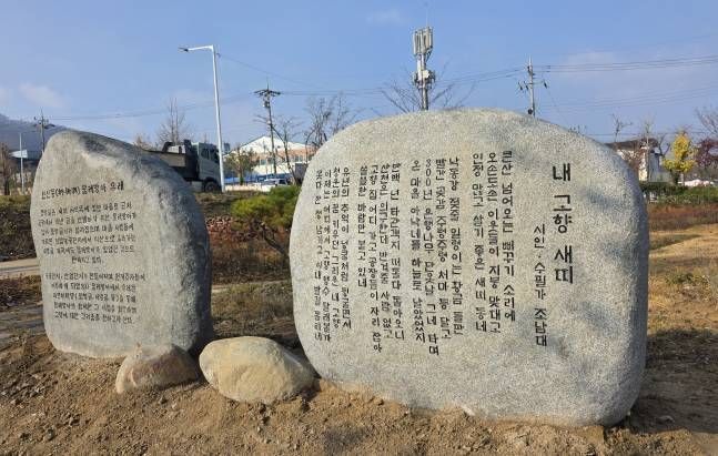 고향은 태어난 장소라는 단순한 지리적 개념을 넘어선다. 그곳에는 삶을 지탱해 온 기억과 부모의 체취가 배어 있다. 계절마다 달라지던 풍경과 고요히 쌓인 시간은 숨결처럼 밀려온다. 자신이 어디에 있던 생의 근원지이니 어찌 쉽게 잊을 수 있으랴. 고향 떠난 많은 시인이 그리움을 시로 위안 받는 것은 이 때문이 아닐까. 스스로 등을 돌리지 않았음에도, 고향을 잃어버린 사람들이 있다. 뉴스 속 이야기로만 바라보던 그런 사연이 어느 날 내 삶 한가운데로 걸어 들어왔다.한국전쟁으로 고향을 등질 수밖에 없었던 실향민들, 댐 건설로 삶의 터전을 잃은 마을 주민들, 개발이라는 이름 아래 떠나야 하는 사람들도 있다. 우리는 그들의 아픔을 얼마나 깊이 헤아려 보았던가. 오래전에 안동댐 건설로 고향 마을이 수몰된 친구가 있었다. 그는 “명절이면 고향의 산천을 보러 갔다가 댐 너머 물결 속 어딘가에 묻힌 옛집을 향해 미련처럼 눈을 굴리다 돌아섰다”라고 했다. 그 이야기를 들었을 때도 무덤덤하게 받아들였다. 명절이면 임진각 망배단에서 차례를 지낸다는 뉴스를 접할 때마다 매년 정례적으로 해 오는 행사를 한다는 정도로 이해했다.어느 날부터인가 우리 마을에 공단이 들어선다는 소문이 퍼지기 시작하더니, 이내 보상 절차가 진행되었다. 오랜 세월 정들었던 논과 밭이 잘려나가고, 집들은 흔적 없이 허물어졌다. 조상들이 잠들어 있던 산소마저 다른 산으로 옮겨야 했다. 은퇴 후 고향에 작은 집을 짓고 농사지으며 옛 친구들과 소박하게 늙어가겠다는 꿈은 허무하게 무너졌다. 삶의 터전이 사라지자 평생 소망하며 버텨낸 날들이 마음 한켠에 허연 재처럼 가라앉았다. 떠난 것이 아니라, 고향이 빠져나간 느낌이었다. 주소는 남았지만, 돌아갈 길은 없었다. 그때 비로소 실향이라는 말을 이해했다. 추억의 뿌리가 뽑혀 나가는 애석함이라 해야 할까. 삶의 바탕이 한순간에 정리되는 느낌이었다. 안동댐으로 수몰된 친구의 심정이 뒤늦게 마음에 와닿는다.살던 흔적이 없어지자 애달픈 마음에서 한 편의 시가 나왔다. 위로라기보다 사라진 땅에 대한 마지막 인사에 가까운 시였다. 2021년 공단 조성 공사가 진행될 무렵 현장 책임자에게 시를 전달했다. 고향을 잃은 사람들이 다시 이곳을 찾았을 때 잠시 서서 마음을 내려놓고 공허한 마음을 달래줄 수 있는 시비 하나를 세워달라고 요청한 것이다. 거창한 기념물이 아니라, 기억이 머물 수 있는 최소한의 자리면 충분하다고 덧붙였다. 좋은 제안이라며 시청에 적극적으로 건의하겠다고 했지만, 정작 행정의 문은 쉽게 열리지 않았다. 시간은 느리게 흘렀다. 검토 중이라는 말은 계절을 몇 번이나 건너뛰었고, 담당자는 수차례 바뀌었다. 공단이 완공되고 회사가 하나둘 들어서면서 시비 건립은 어느새 관심에서 멀어진 듯 보였다.그렇게 네 해가 흘렀다. 그동안 여러 번 관계자와 통화하고 마을 이장과 주민들을 만났다. 고향을 잃은 사람들의 이야기를 전하며 시비 건립의 필요성을 설명했다. 누군가는 공감했고, 어떤 이는 현실적인 어려움을 말했다. 그러던 중 뒤늦게 주민센터로 업무가 이관되었다는 소식을 들었다. 예산 문제로 착공이 지연되던 중 2025년 8월 마침내 고향 마을 입구에 공원을 조성하고, 마을 유래비와 함께 시비도 세우겠다는 연락이 왔다. 체념하다시피 한 상태에서 들은 말이라 실감이 나지 않았다. 예상보다 큰 규모였다. 7억 원이 넘는 예산이 투입되어 산업단지 옆 국도변에 테마공원을 만들어 마을 이름인 ‘물방골’을 형상화한 지름 5m의 거대한 물레방아가 힘차게 돌아가기 시작했다. 마침내 시비가 들어설 자리가 눈 앞에 펼쳐지자 심장의 박동이 한층 또렷해졌다.늦가을의 바람이 스미던 11월 말, 드디어 제 모습을 드러냈다. 시비 앞에 서서 한동안 아무 말도 하지 못했다. 시를 다시 읽어보니 어린 시절 고향의 풍경이 파노라마처럼 펼쳐졌다. 살던 집과 아버지와 함께 농사짓던 들녘, 단옷날 은행나무에서 그네 타던 아낙네들, 여름날 개울에서 목욕하던 동무들의 풍경이 떠올랐다. 처마 밑에 주렁주렁 달린 곶감 또한 내게로 걸어왔다. 답답한 진행 상황을 들을 때마다 그만두고 싶은 순간도 있었지만, 참고 견뎌 냈기에 보람은 말로 다 할 수 없을 만큼 크다. 고향은 사라졌으나, 시비가 묵묵히 자리하고 있으니 그리워하는 많은 이들에게 작은 위로가 되지 않을까.사람들의 반응도 이어졌다. 부럽다는 말, 축하의 인사와 함께 소속된 문인단체에서는 이번에 상주로 문학기행을 가자며 반가운 제안을 해왔다. 정호승 시인은 “슬픔은 나눌수록 꽃이 된다”고 말했다. 고향을 잃은 상처가 시비를 통해 공유되는 순간, 그 슬픔은 비로소 나 혼자의 것이 아니라 많은 이들의 기억으로 서서히 넓어지고 있다는 것을 느꼈다. 이곳이 유명 문인의 기념관처럼 북적이기를 바라지 않는다. 다만 고향을 잃은 사람들이 여기를 찾았을 때, 따뜻한 말 한마디에 기대어 옛 기억을 소환해 볼 수 있기를 바란다. 돌아갈 집은 없어도, 잠시 머물 수 있는 자리를 내줄 수 있지 않을까.공원에 듬직하게 서 있는 시비는 누가 언제 찾더라도 반갑게 맞아 줄