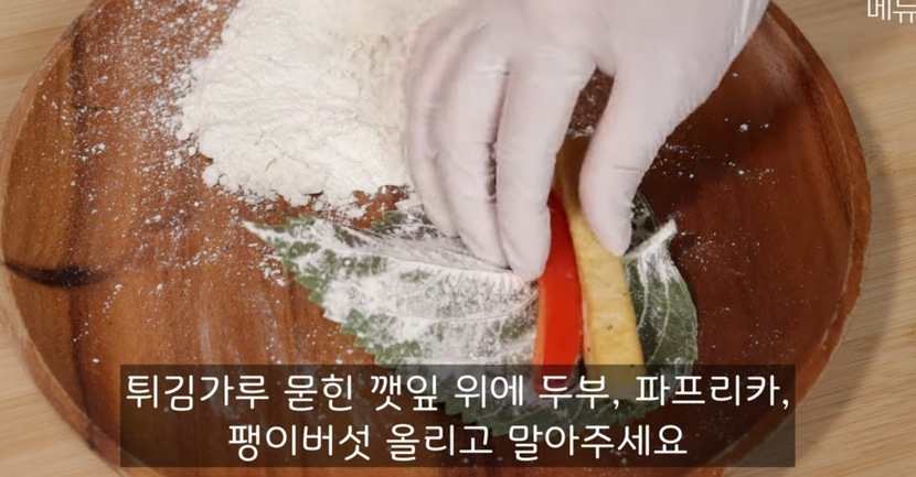튀김가루를 살짝 묻힌 깻잎에 앞서 준비한 재료들을 올려준다. 두부, 파프리카, 팽이버섯을 차례로 올리고 말아준다. 이후 깻잎롤에 계란물을 묻혀준 후 프라이팬 약불에 노릇하게 구워준다.