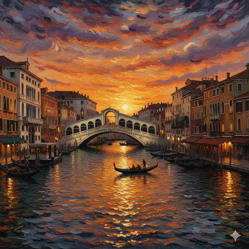 1일 전 3,590 읽음 베네치아 카날 그란데의 석양 소아과의사 구독하기 112 131 콘텐츠의 수익 139 화려한 석양: 고흐 특유의 역동적인 소용돌이 붓 터치로 타오르는 듯한 주황색, 보라색, 금색이 어우러진 노을 지는 하늘을 담았습니다.금빛 물결: 운하의 물결은 지는 햇살을 머금어 반짝이는 황금빛 임파스토(Impasto) 기법으로 표현되어 생동감이 넘칩니다.낭만적인 분위기: 석양을 받아 황금빛으로 빛나는 리알토 다리와 건물들, 그리고 그 사이를 유영하는 곤돌라들이 조화를 이루어 서정적인 분위기를 자아냅니다. 131 0 / 300 입력