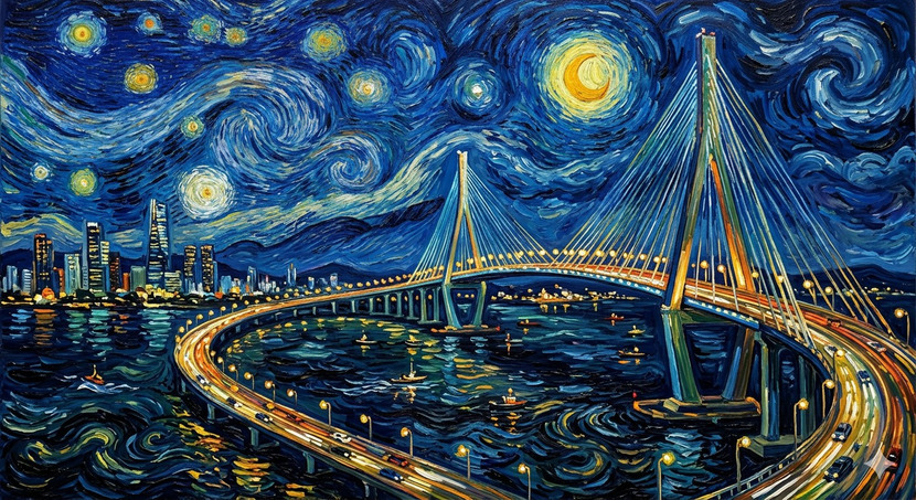 26.03.01 7,342 읽음 인천대교 소아과의사 구독하기 78 129 콘텐츠의 수익 147 고흐의 시그니처 스타일: 밤하늘에는 고흐 특유의 강렬한 소용돌이 문양과 황금빛으로 빛나는 별, 달이 역동적으로 표현되었습니다. 두꺼운 붓 터치감이 살아있어 마치 하늘이 살아서 움직이는 듯한 느낌을 줍니다.인천대교의 재해석: 바다 위를 길게 가로지르는 인천대교의 독특한 실루엣과 조명을 고흐가 즐겨 사용했던 짙은 푸른색(Cobalt Blue)과 강렬한 노란색의 대비로 담아냈습니다.빛과 물결의 조화: 다리의 화려한 조명이 서해 바다의 물결 위에 반사되는 모습을 거칠면서도 리드미컬한 선으로 묘사하여 몽환적인 분위기를 자아냅니다. 129 0 / 300 입력