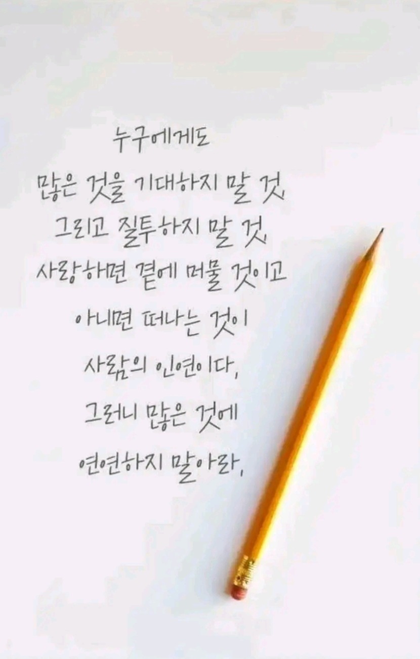 26.03.01 343 읽음 행복하다고 말하는 동안은 나도 정말 행복한 사람이다. 💖바람과함께~💕(답방♡) 구독하기 52 55 콘텐츠의 수익 15 행복하다고 말하는 동안은나도 정말 행복한 사람이 되어마음에 맑은 샘이 흐릅니다. 고맙다고 말하는 동안은고마운 마음 새로이 솟아올라내 마음도 더욱 순해집니다. 아름답다고 말하는 동안은나도 잠시 아름다운 사람이 되어마음 한 자락환해지는 아름다운 사람이 됩니다 좋은 말이 나를 키우는 걸나는 말하면서 다시 알게 됩니다.-'좋은 글' 중에서- 55 0 / 300 입력