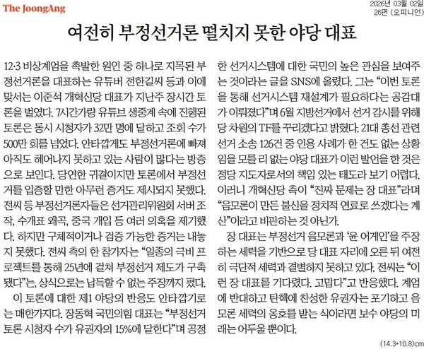 그러나 2일 자 조선일보와 중앙일보는 장동혁 대표를 비판하는 사설을 냈다. 먼저 중앙일보는 “제1야당의 반응이 안타깝다” “보수 야당 미래는 어두울 뿐”이라고 했다.