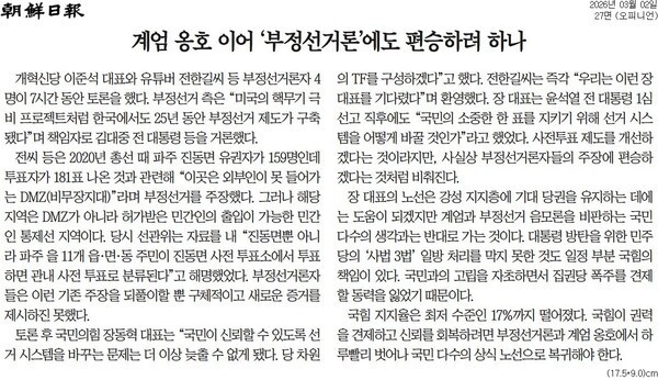 조선일보도 「계엄 옹호 이어 ‘부정선거론’에도 편승하려 하나」 사설에서 “장 대표는 윤석열 전 대통령 1심 선고 직후에도 ‘국민의 소중한 한 표를 지키기 위해 선거 시스템을 어떻게 바꿀 것인가’라고 했었다. 사전투표 제도를 개선하겠다는 것이라지만, 사실상 부정선거론자들의 주장에 편승하겠다는 것처럼 비춰진다”라고 지적했다.