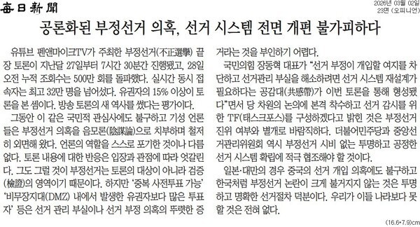 매일신문은 “더불어민주당과 중앙선거관리위원회 역시 부정선거 시비 없는 투명하고 공정한 선거 시스템 확립에 적극 협조해야 할 것”이라며 “일본·대만의 경우 중국의 선거 개입 의혹에도 불구하고 한국처럼 부정선거 논란이 크게 불거지지 않는 것은 투명하고 명확한 선거절차 덕분이다. 우리가 이들 나라보다 못할 것은 전혀 없다”라고 주장했다.