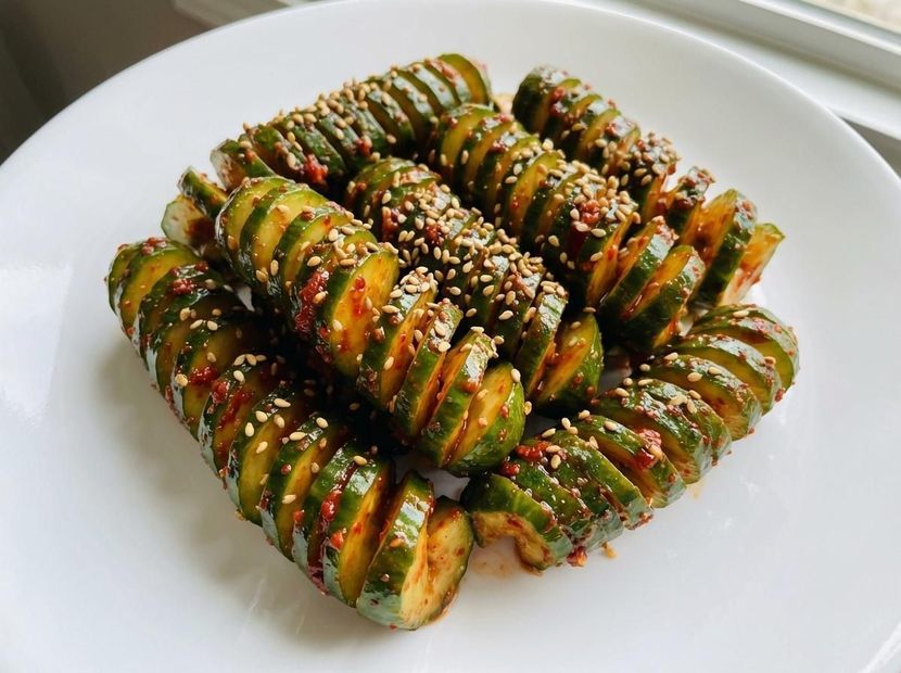 평범한 오이 무침이 지겨운 이들에게 추천하는 새로운 오이 반찬 꿀팁이 있다.평범한 오이가 나무젓가락 두 개만으로 전혀 다른 비주얼로 변한다. 일명 ‘오이 아코디언’ 혹은 ‘오이 스프링’으로 불리는 손질법이다. 겉보기에는 복잡해 보이지만, 원리는 단순하다. 오이 아래에 나무젓가락을 받쳐 칼이 끝까지 내려가지 않도록 막아 주는 것이다. 그 결과 오이는 끊어지지 않은 채 촘촘한 칼집이 들어가며 스프링처럼 늘어나는 형태가 된다.