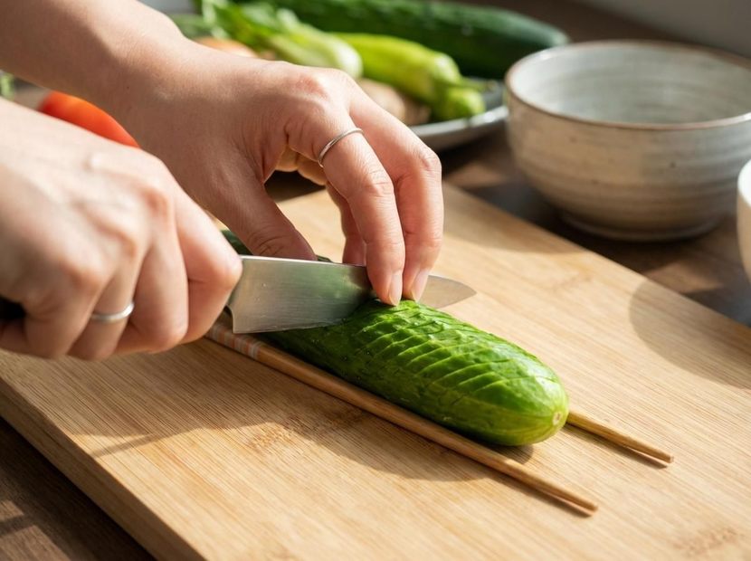 이후 오이를 뒤집어 같은 방식으로 반대 방향 칼집을 넣는다. 그러면 겉면에 교차 칼집이 생기며 자연스럽게 아코디언 모양이 완성된다. 마지막으로 먹기 좋은 길이로 썰면 된다.이 과정에서 많은 이들이 궁금해하는 부분은 오이가 끊어지지 않는 이유다. 나무젓가락이 물리적 받침 역할을 하면서 칼날 깊이를 일정하게 제한하기 때문에, 칼집은 촘촘히 들어가되 중심부는 연결된 상태로 유지된다. 칼을 힘으로 조절하는 대신 도구로 깊이를 제어하는 방식이다.