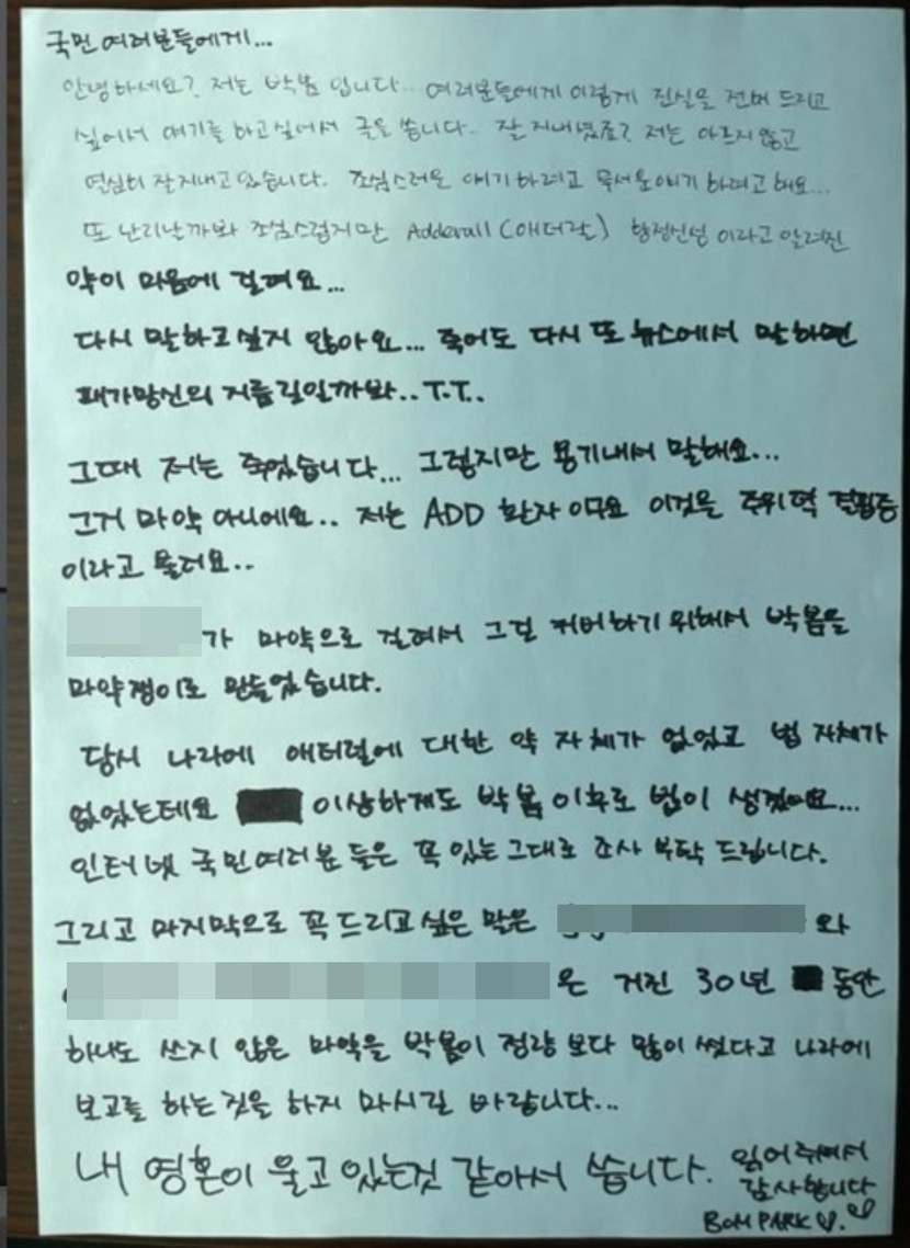 특히 박봄은 "OOOO이 마약으로 걸려서 그걸 커버하기 위해서 박봄을 마약쟁이로 만들었다”라며 “당시 나라에 애더럴 약 자체가 없었고, 법 자체가 없었는데 이상하게 박봄 이후에 법이 생겼다. 인터넷 국민 여러분들은 꼭 있는 그대로 조사 부탁드린다”라고 말했다.
