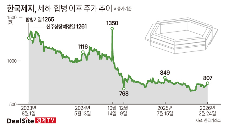 다만 회사 실적은 기대에 미치지 못하고 있다. 흡수합병으로 사세를 키운 덕분에 외형 성장에는 성공했지만 내실을 다지는데는 실패해서다. 실제 2022년 6848억원이었던 매출은 2023년 7120억원, 2024년 7921억원, 2025년 7538원으로 집계됐다. 반면 영업이익은 같은 기간 214억원→135억원→193억원→33억원 순으로 나타났다. 가뜩이나 제지업종이 사양산업으로 꼽히는 가운데 지배구조 개편에 따른 사업 시너지도 묘연하다 보니 한국제지에 대한 투자 매력이 떨어지고 있는 셈이다.
