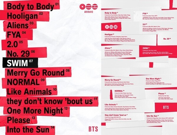 새 음반은 방탄소년단의 정체성과 지난 여정에서 쌓은 정서를 아우른다. 타이틀곡 ‘SWIM’은 업비트한 얼터너티브 팝 장르 곡이다. 삶의 파도 속에서 멈추지 않고 계속 헤엄쳐 나아가는 자세를 노래한다. 밀려오는 흐름을 거스르기보다 자신만의 속도로 담담히 넘어가겠다는 의지를 ‘삶에 대한 사랑’으로 풀었다. RM이 작사 전반을 맡아 곡의 메시지에 진정성을 더했다.