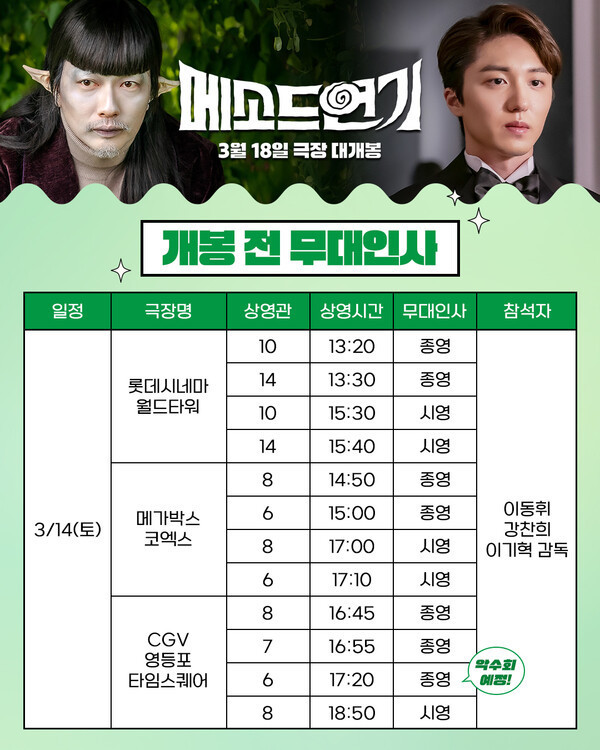 오는 3월 14일(토) 진행되는 무대인사에는 연기 변신을 위해 과몰입 열정을 불태우는 배우 ‘이동휘’ 역을 맡은 이동휘를 비롯해 극 중 ‘이동휘’에게 공개적으로 차기작 러브콜을 보내는 톱스타 ‘정태민’ 역을 맡은 강찬희, 그리고 '메소드연기'의 연출을 맡은 이기혁 감독이 출격한다. 이들은 롯데시네마 월드타워, 메가박스 코엑스, CGV 영등포를 차례로 방문해 관객들을 만날 예정이다. 이날 무대인사 현장에서는 이동휘, 강찬희, 이기혁 감독이 준비한 특별한 굿즈 증정과 함께, 영화를 감상한 후 SNS에 리뷰를 남기면 추첨을 통해 경품을 제공하는 이벤트도 진행된다.