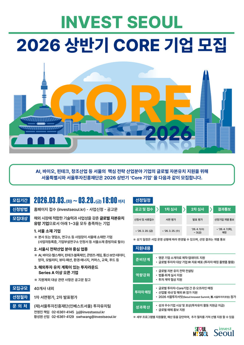 서울투자진흥재단, ‘2026 Core기업’ 모집…글로벌 자본 유치 지원