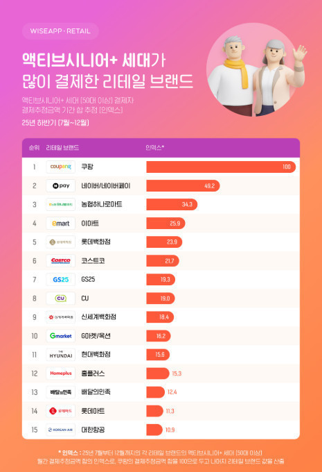 전통적인 시니어 선호 브랜드로 꼽히던 오프라인 유통사들은 그 뒤를 이었다. 농협하나로마트가 34.3으로 3위에 올랐으며 이마트는 25.9로 4위를 차지했다. 롯데백화점(23.9), 코스트코(21.7), 신세계백화점(18.4), 현대백화점(15.6) 등 백화점과 창고형 마트들도 상위권에 이름을 올렸으나 1위인 쿠팡과의 수치 차이는 현격했다. 편의점 브랜드인 GS25와 CU는 각각 19.3과 19.0의 인덱스를 기록하며 백화점 못지않은 결제 규모를 나타냈다. 이외에도 G마켓/옥션(16.2), 홈플러스(15.3), 배달의민족(12.4), 롯데마트(11.3), 대한항공(10.9) 순으로 결제 금액이 높게 집계됐다.