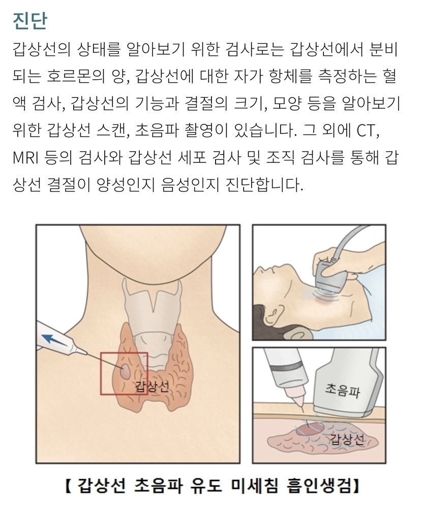 갑상선을 검사할 수 있는 방법으로는 혈액 내의 갑상선 호르몬 및 갑상선에 관련된 항원과 항체를 확인하는 갑상선 기능 검사와 결절의 크기, 모양, 위치, 개수 등을 알 수 있는 초음파 검사가 있습니다.