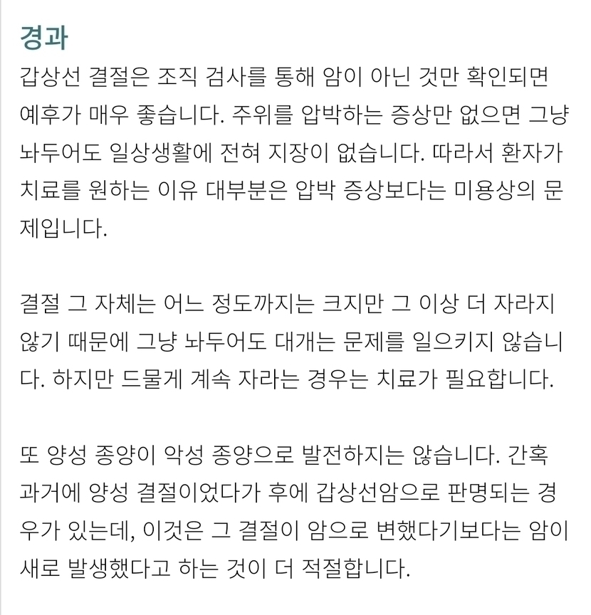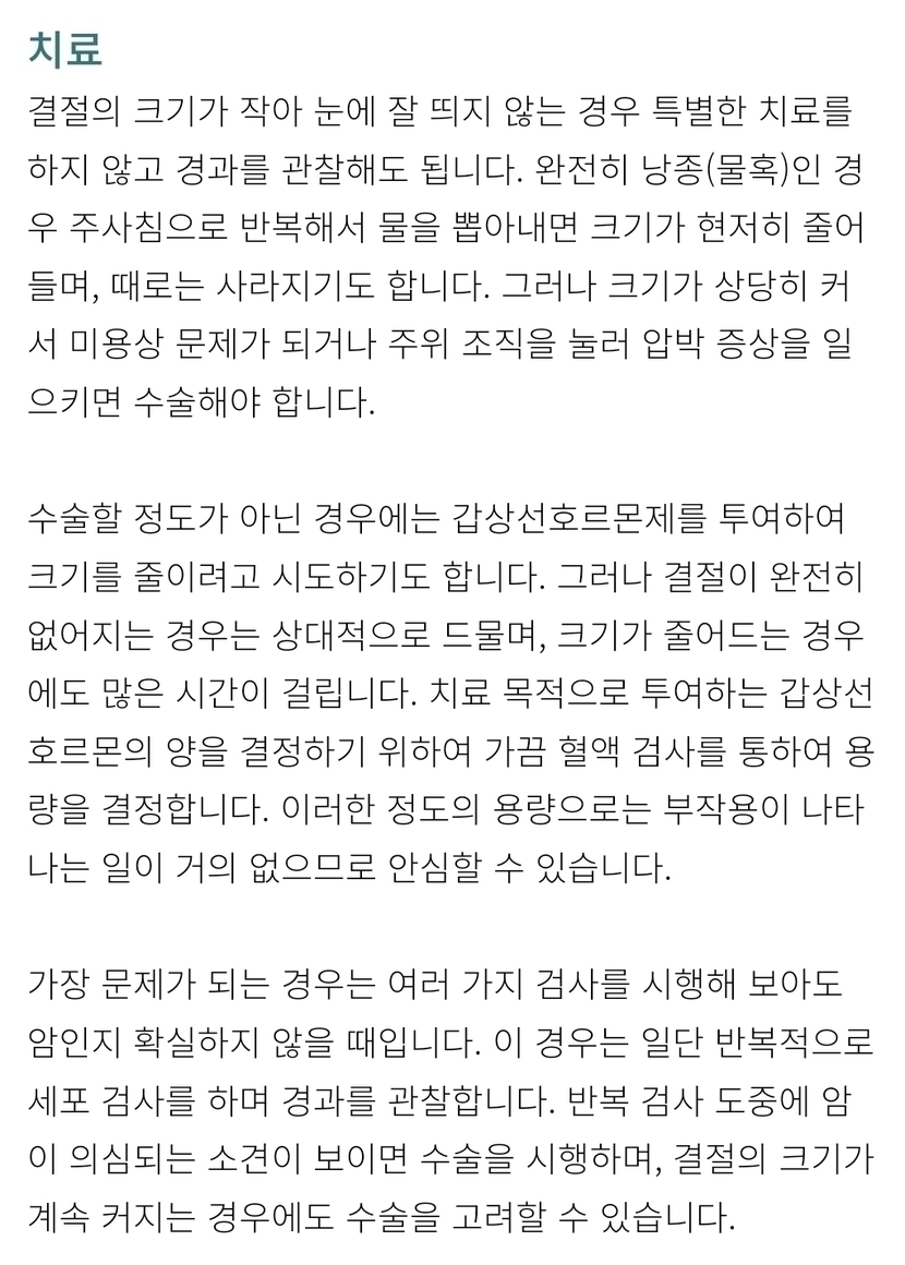 갑상선 결절은 양성 종양이기에 생명을 위협하지 않습니다.