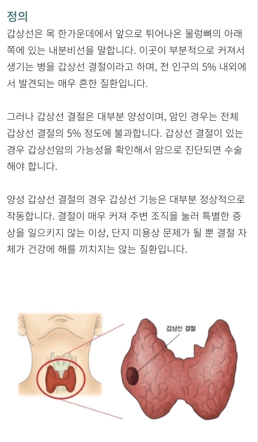 갑상선 결절은 흔하게 발생할 수 있는 갑상선 질환 중 하나이며, 갑상선에 생기는 양성 종양을 의미합니다.