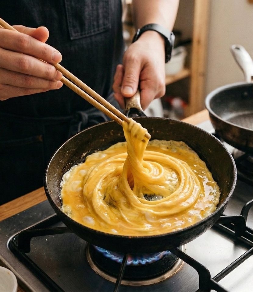 너무 늦게 집으면 계란이 이미 굳어 버려 모양을 만들기 어렵고 너무 빨리 집으면 형태가 흐트러질 수 있으므로 타이밍이 중요하다. 젓가락으로 계란을 집은 상태에서 손목을 이용해 천천히 원을 그리듯이 돌리면 계란이 자연스럽게 말리면서 소용돌이 모양이 만들어진다.