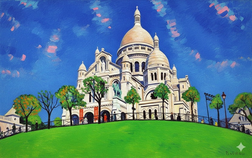 단순화된 형태와 명확한 윤곽선: 대성당의 복잡한 세부 묘사를 과감히 생략하고 단순화된 형태로 표현했습니다. 또한, 각 대상을 굵고 명확한 윤곽선으로 둘러싸 야수파 특유의 간결하고 장식적인 느낌을 줍니다.