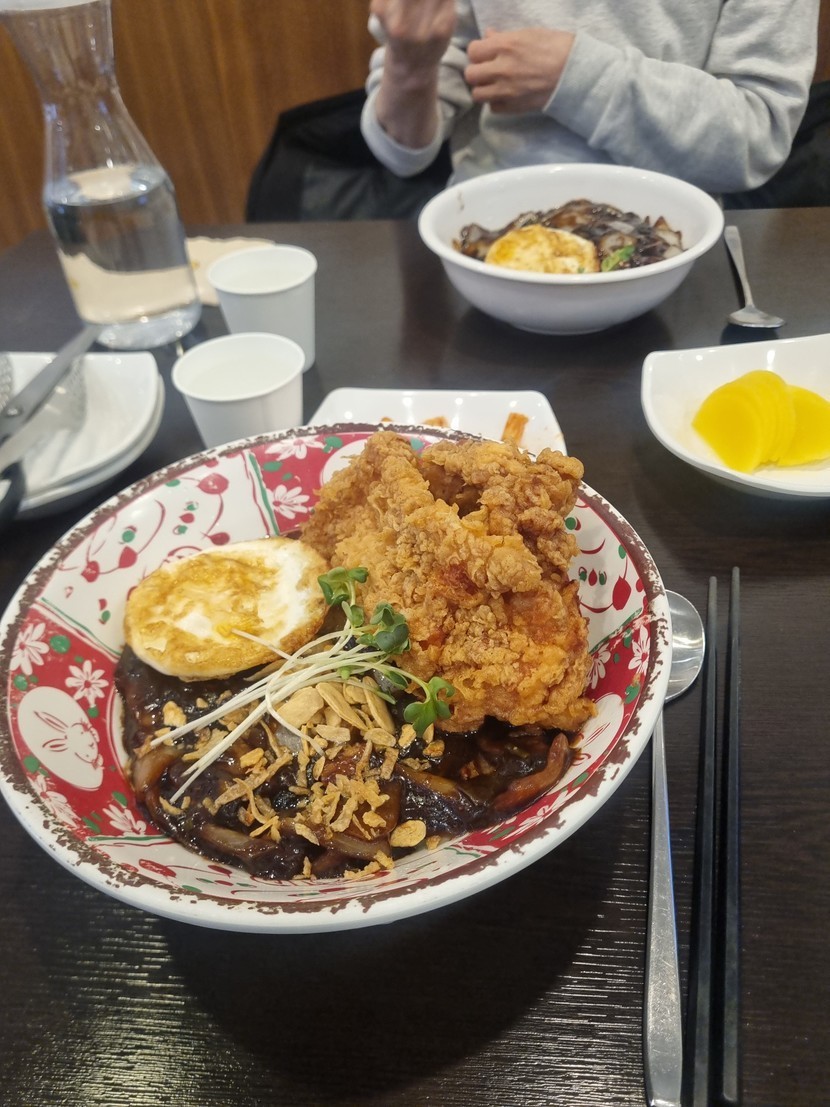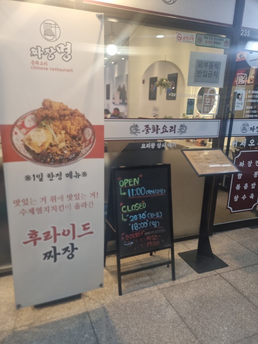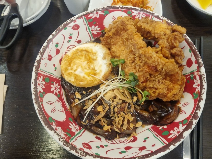 리뷰가 좋기도 해서 기대하고 갔는데 막상 가보니 짜장면 위에 후라이드 치킨에 계란이 놓여져 있는 거더라고요~ 저는 약간 섞어서 나오는 줄 알았는데~~~