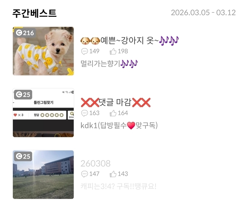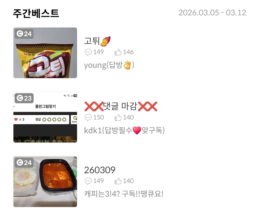 5일 전 971 읽음 260312 캐피는3!4? 구독!!땡큐요! 구독하기 137 137 콘텐츠의 수익 29 제육 저번에 남은거랑닭가슴살 마지막 한봉섞어서 냠냠 주간베스트 감사합니다 숫자놀이 오늘도 웃는 좋은하루되세요 137 0 / 300 입력