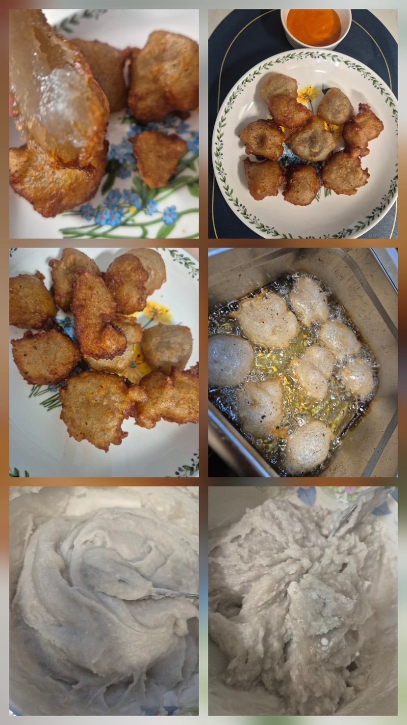 4. 수저 2개를 이용해서 기름이 끓을 때 감자반죽을 한스푼(크기조절가능)씩 떨어뜨려 튀기면 쫀득쫀득한 길감자 완성