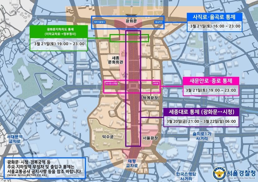 인파가 급격히 몰릴 경우 통제 범위가 확대될 가능성도 있다. 사직공원 교차로와 독립문 교차로, 서대문 교차로, 경찰청 교차로, 숭례문 교차로, 회현 교차로, 을지로2가 교차로, 종로2가 교차로, 안국역 교차로 등 주요 지점까지 통제가 확대될 수 있다.