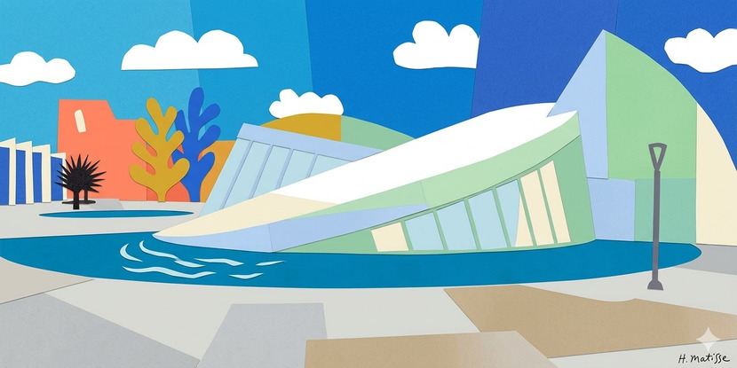 건물 앞의 수공간과 배경의 하늘을 다양한 톤의 푸른색 면들로 구성했습니다. 특히 물결을 상징하는 하얀색 곡선과 하늘에 떠 있는 뭉게구름 모양의 조각들은 마티스 작품 특유의 리듬감을 만들어내며, 화면 전체에 시원하고 맑은 에너지를 불어넣습니다.
