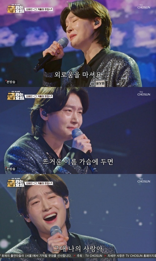 100점을 향한 그의 노래가 시작됐다. 김용빈은 부드러운 목소리로 노래의 감정을 전달했다. 애절함을 폭발시키는 그의 노래에 사람들이 빠져들었다. 김용빈의 무대를 본 가수들도 박수를 보냈다.