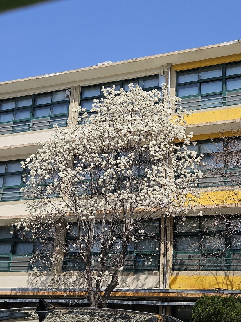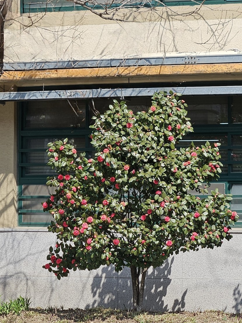 학교 유리창 앞에 핀 목련과 동백