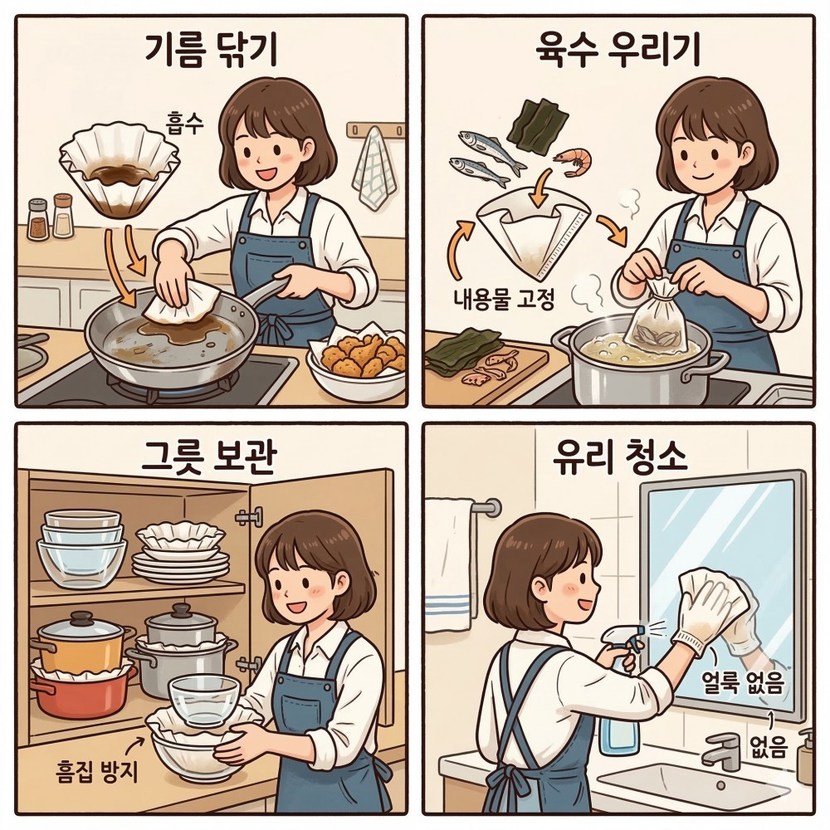 다. 프라이팬을 사용한 뒤 남은 기름을 닦아낼 때 키친타월을 사용하는 경우가 많은데, 이때 커피 필터를 대신 활용할 수 있다. 커피 필터는 액체를 흡수하면서도 쉽게 찢어지지 않는 구조로 만들어져 있어 기름을 닦아낼 수 있는 강도를 갖는다. 또한 보풀이 거의 발생하지 않아 팬 표면에 잔여물이 남지 않는다는 점도 장점이다. 특히 튀김 요리를 한 뒤 남은 기름기를 정리할 때 간편하게 사용할 수 있어 실용적이다.