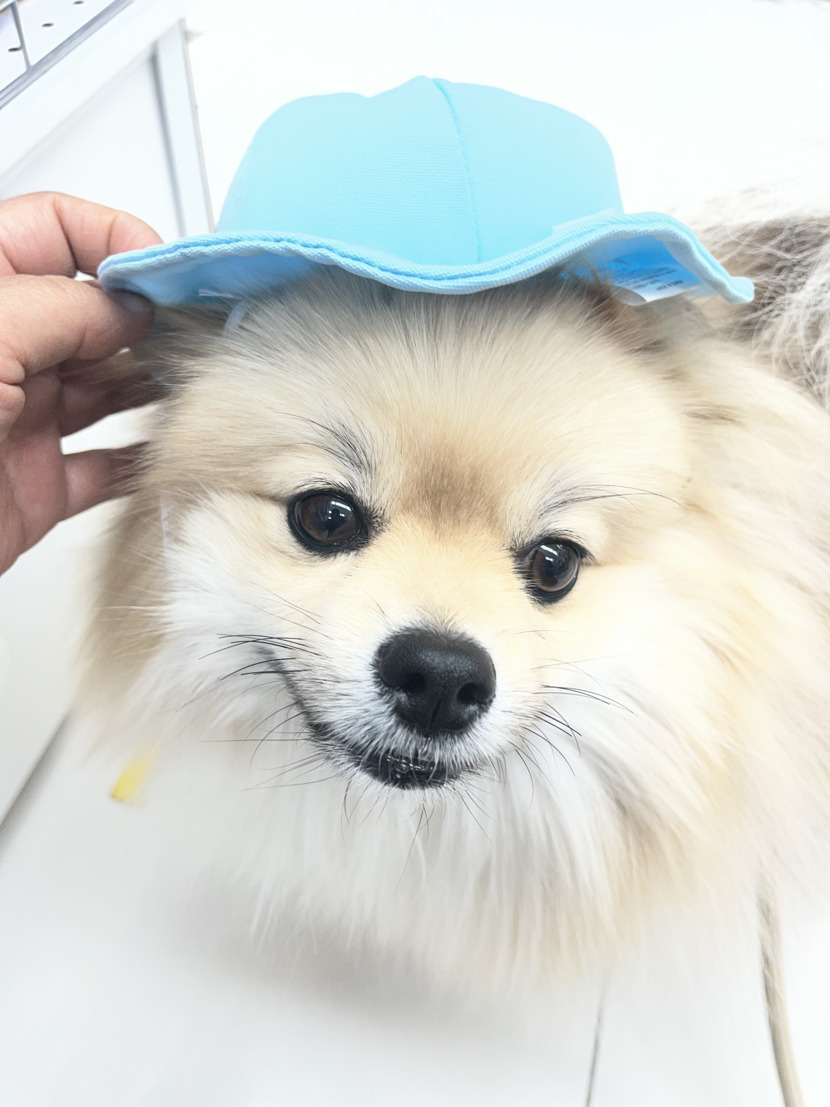 주말에 산책 갔다가 다이소에서 강아지모자 써봤어요
