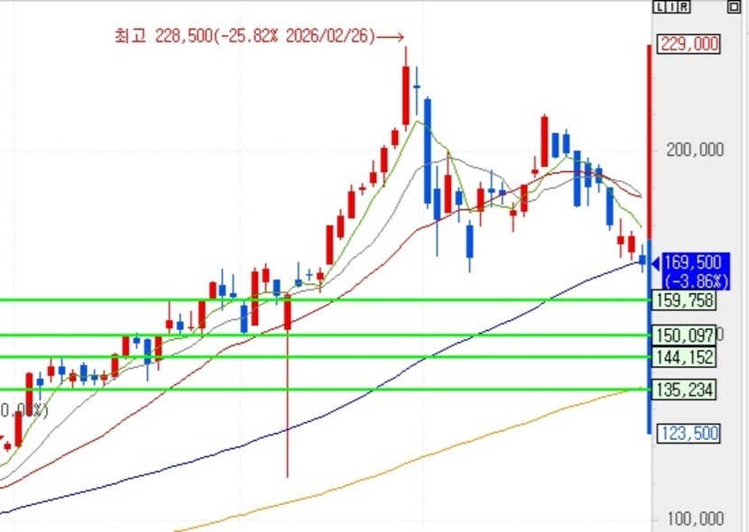 여기가 무너진다면 제가 다음 16만원 지지선에서 지지해주는지 확인해봐야 하고, 16만원이 무너진다면 제가 기다리는 가격 15만원까지 내려올 가능성도 있습니다.