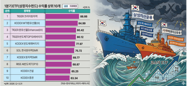 수익률 측면에서는 미래에셋자산운용의 TIGER 상품이 ETF 수익률 1위를 차지했다. 올해 1월 2일부터 이날까지 수익률 1위는 'TIGER 코리아원자력'(88.66%)이었다. 삼성자산운용의 'KODEX WTI원유선물(H)'(84.99%), 'TIGER 원유선물Enhanced(H)'(80.42%), 'TIGER 반도체TOP10레버리지'(80.12%), 'KODEX 반도체레버리지'(77.97%) 등의 순이었다.
