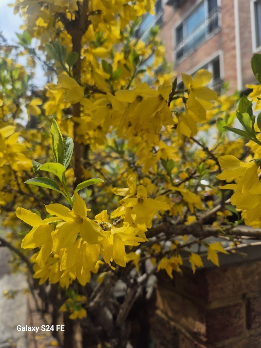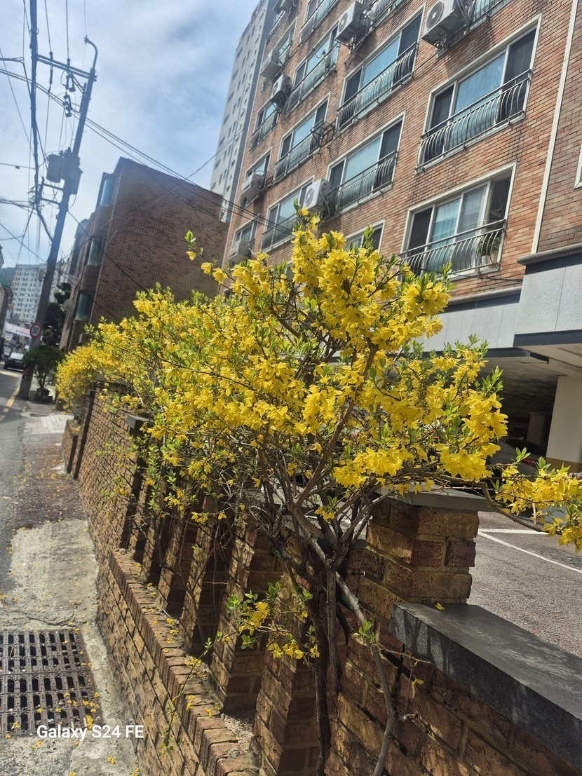 예쁜 개나리담장 흐드러지게 피었네요