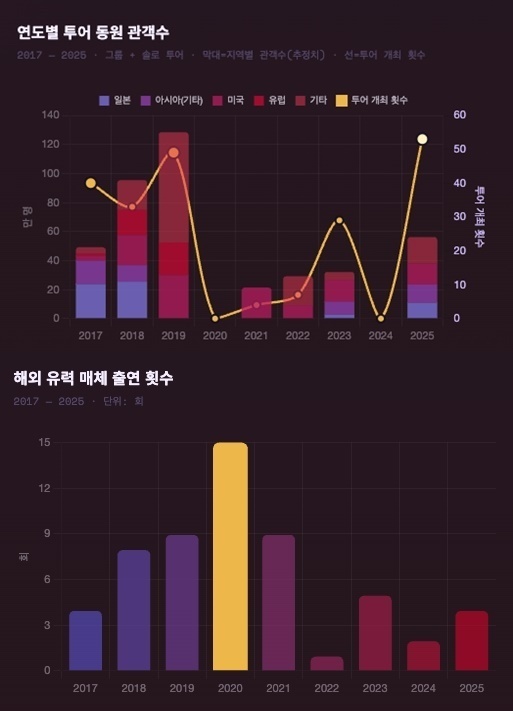 공연 데이터는 그 확장을 더 입체적으로 보여준다. 한터 리와인드 자료에 따르면 방탄소년단의 2017년 투어가 일본 비중 48.3%의 아시아 중심 구조였다면, 2018년 유럽 진출을 계기로 관객 구성이 빠르게 다변화됐다.