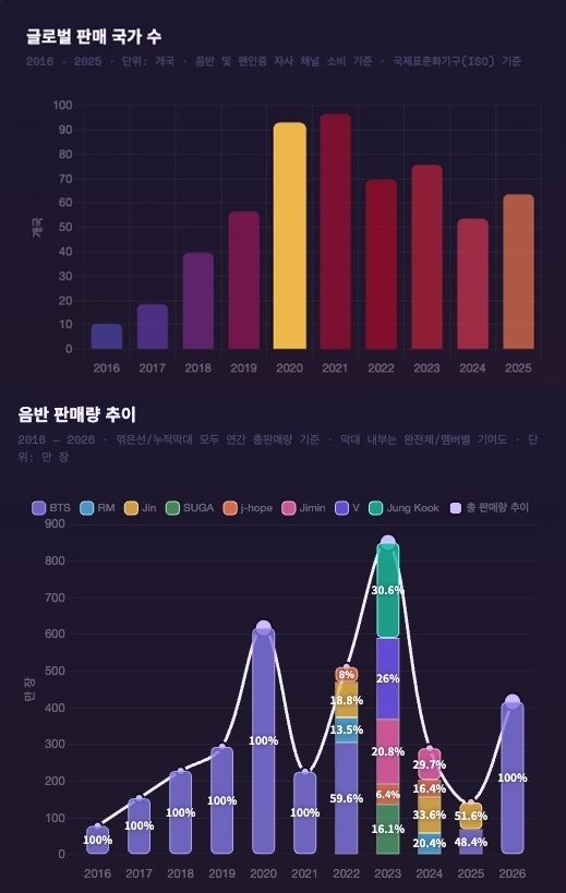한터 리와인드에 따르면 방탄소년단의 누적 음반 판매량은 3809만 장, 팬 인증 국가 최대 190여 개국, 투어 총동원은 411만 명, 해외 유력 매체 출연은 총 57회에 달했다. 이 네 개의 숫자만 놓고 봐도 BTS의 세계화는 인기의 확장이 아니라 유통, 공연, 미디어 노출이 동시에 커진 '산업적 팽창'에 가까웠다.